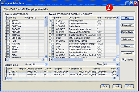 The header record is also known as the master record and there is one master record per sales order. On the left side is the file that was selected in the previous step (which is identified as the source) and on the right side is the Sales Order master file (which is identified as the target). At the bottom of the screen is an example of what the data looks like based upon the import file. This is a where a review of the import data can occur and will show how the fields in the import file line up with the target tables. Next to the Sales Order master file are a series of buttons. These buttons allow the user to select the mapping criteria. The mapping criteria selection is as follows: